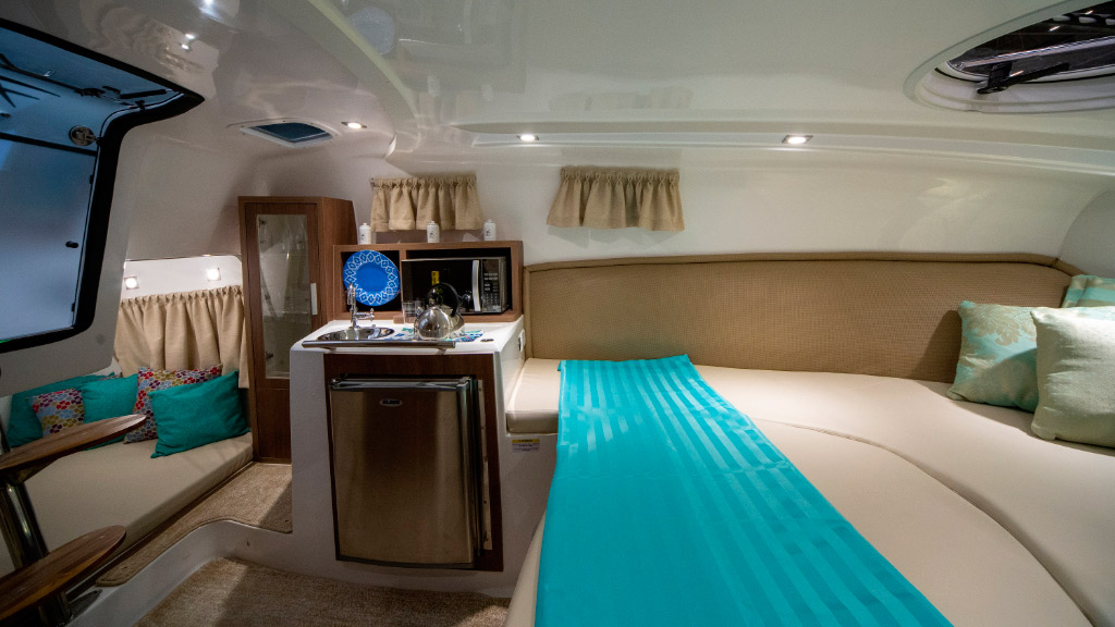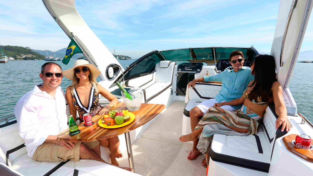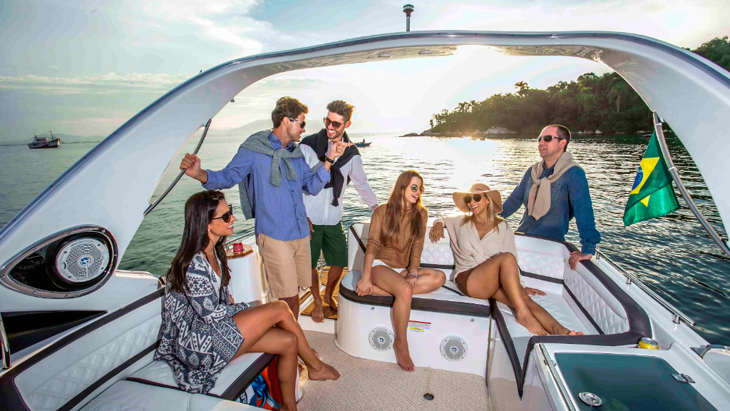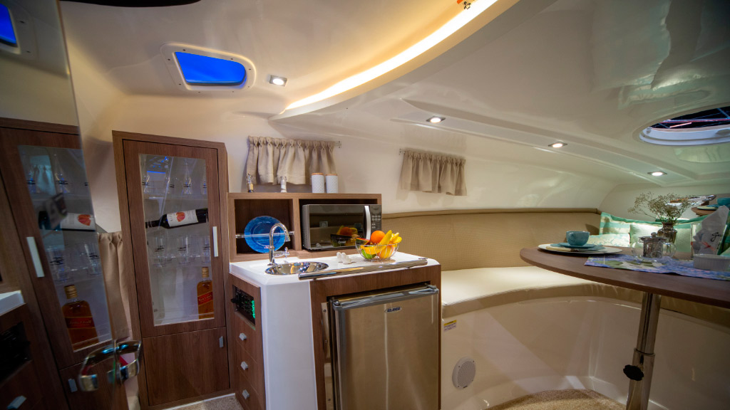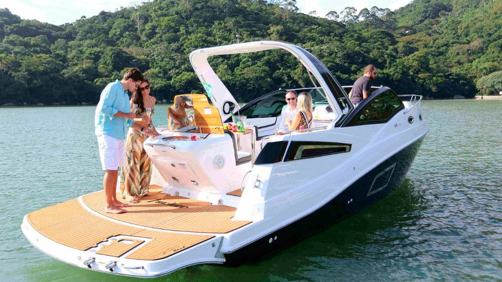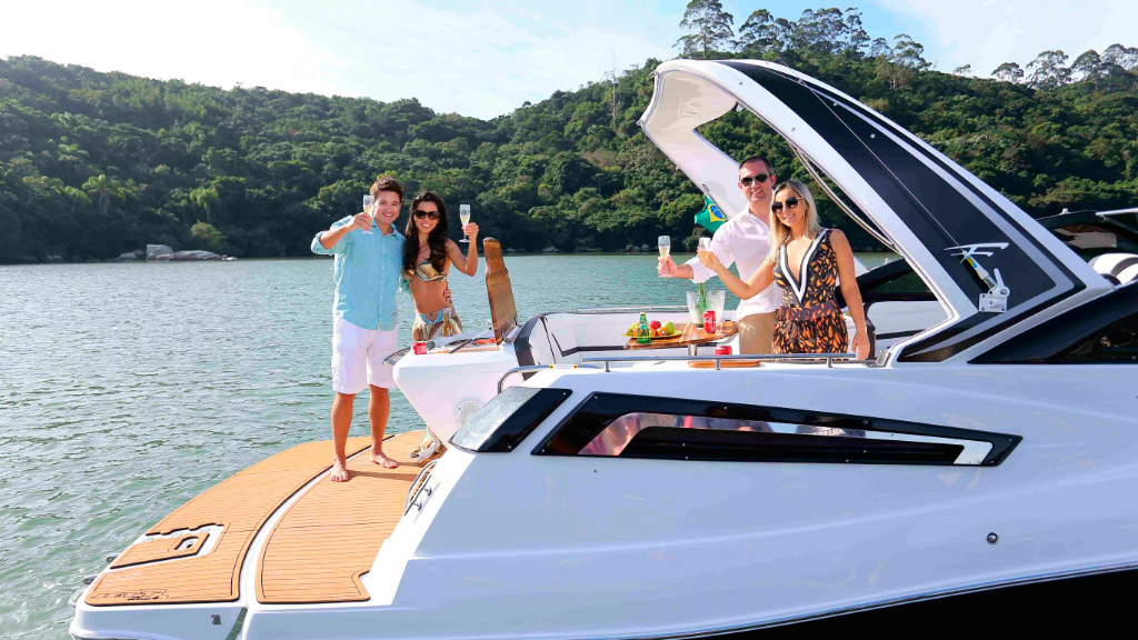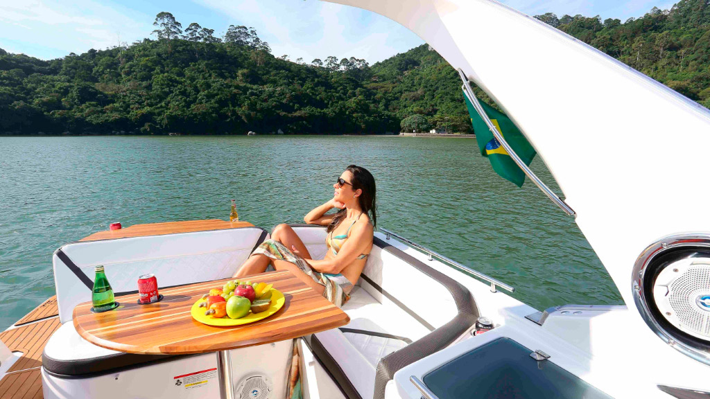 Amplo espaço no cockpit aliado ao belo espaço gourmet em sua plataforma de popa, proporciona momentos de conforto e lazer.