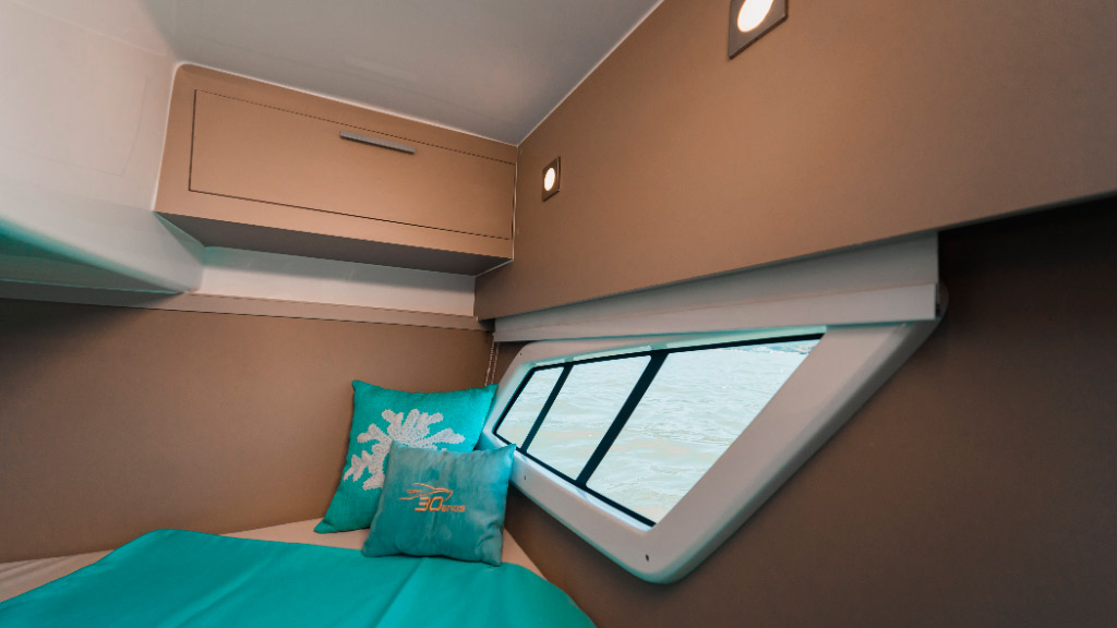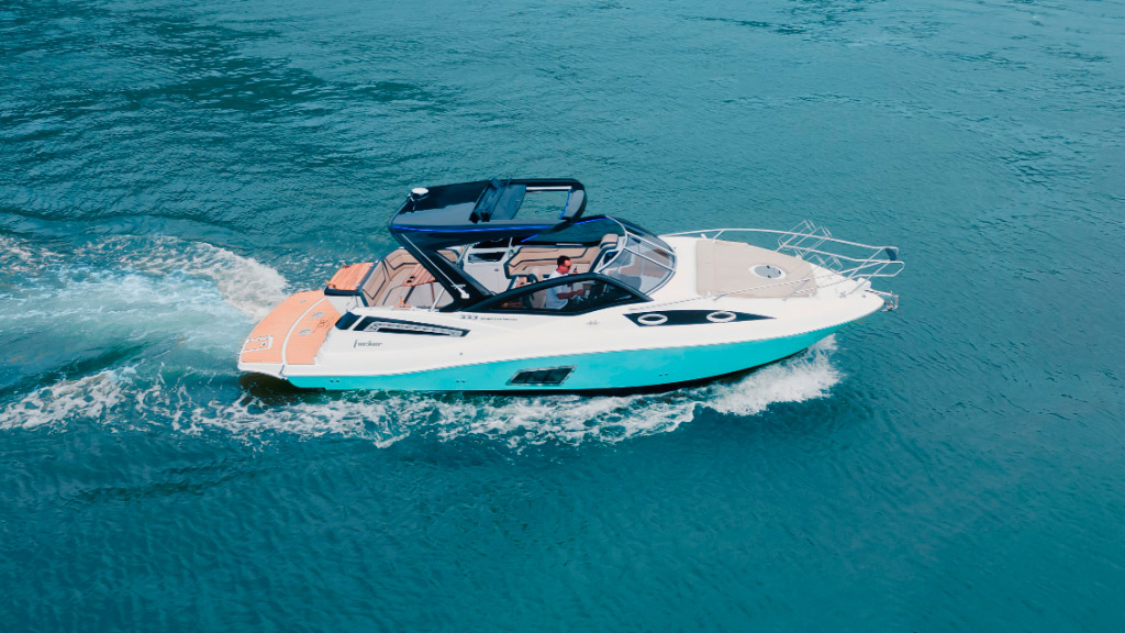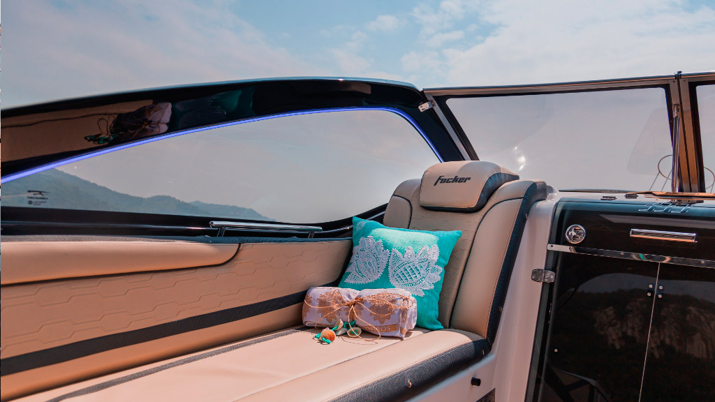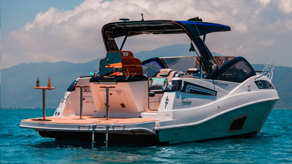 A Focker 333 Gran Turismo, edição comemorativa de 30 anos do estaleiro, é marcada pelo design imponente e esportivo, trazendo um acabamento exclusivo em led.
