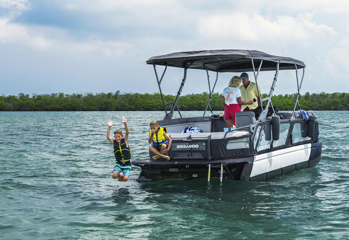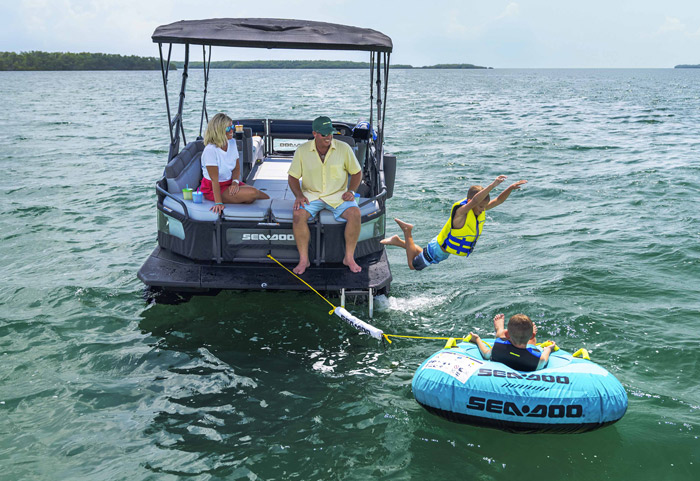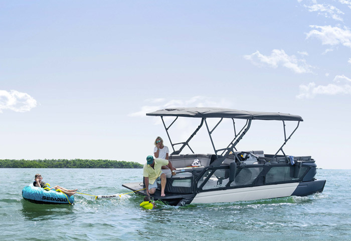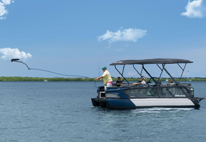 O modelo Cruise apresenta detalhes especiais de conforto, como capacidade para até 10 pessoas, sistema de áudio BRP, ampla plataforma de mergulho com sistema LinQ de engate rápido, GPS touchscreen Garmin de 7 pol. e muito, muito mais.